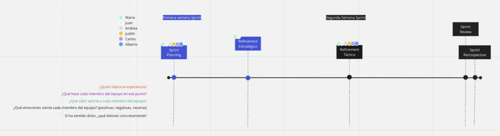 En el pla horitzontal, anotarem les diferents experiències que viu l’equip durant l’Sprint: començarem per la sessió de Sprint Planning i seguirem amb la resta de vivències fins arribar a la sessió de Retrospective.